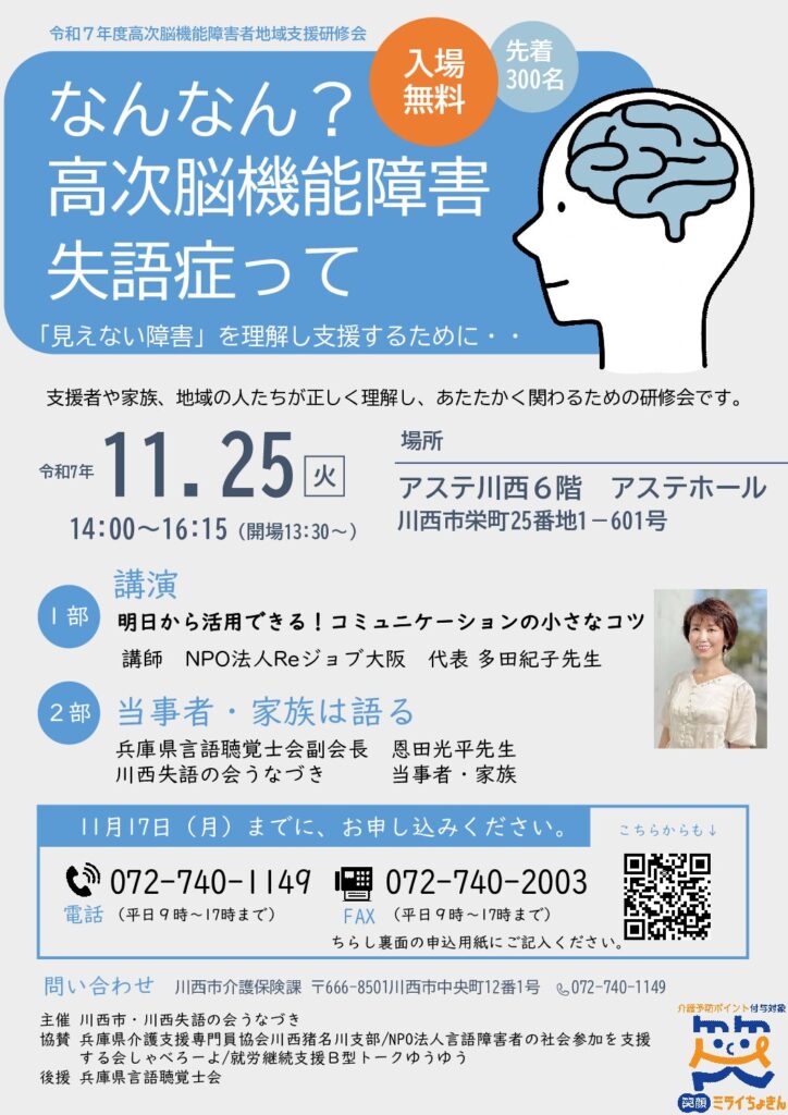 【講演会のお知らせ】11/25(火) 川西市にて「なんなん?高次脳機能障害・失語症って」に、代表 多田紀子が登壇します!