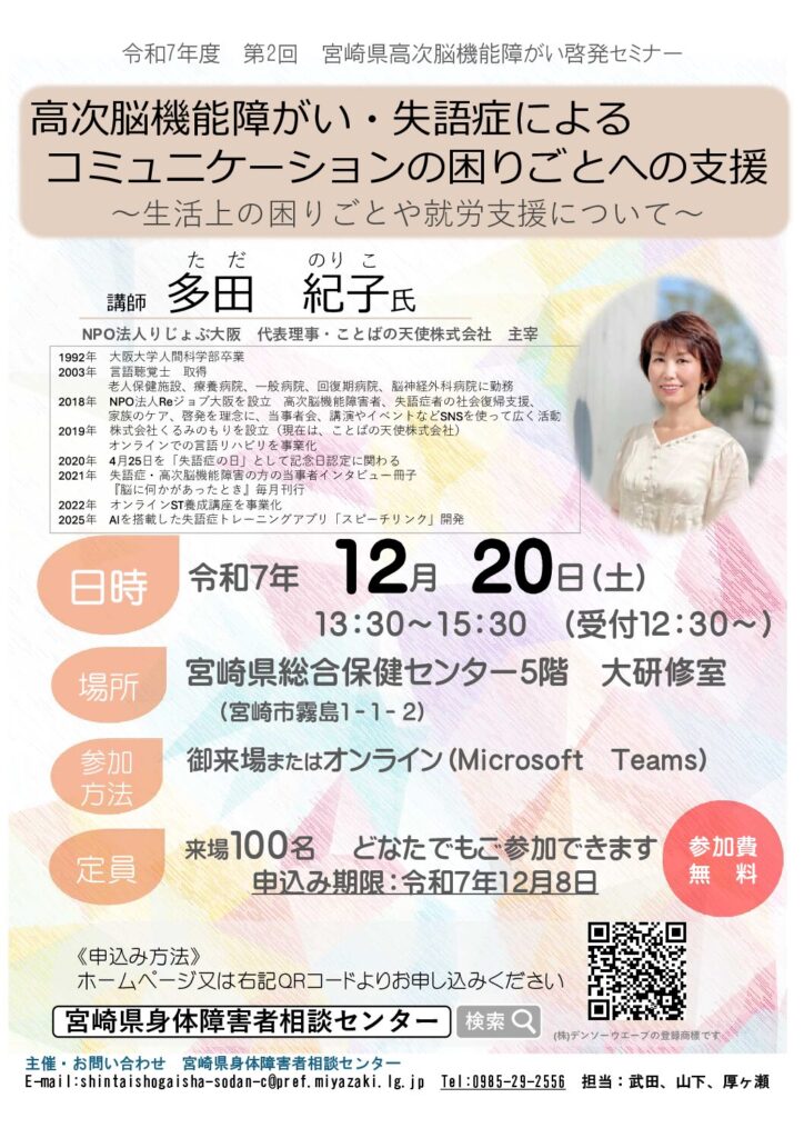 令和7年12月20日(土)、宮崎県身体障害者相談センター主催の「第2回 宮崎県高次脳機能障がい啓発セミナー」にて、当法人代表の多田紀子が講師を務めます。